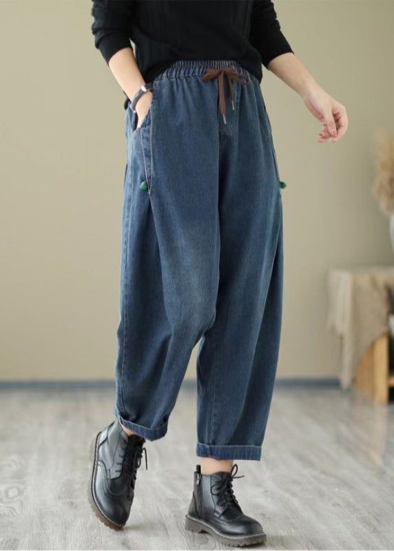 French Blue Pockets Lace Up Elastic Waist Jeans Fall