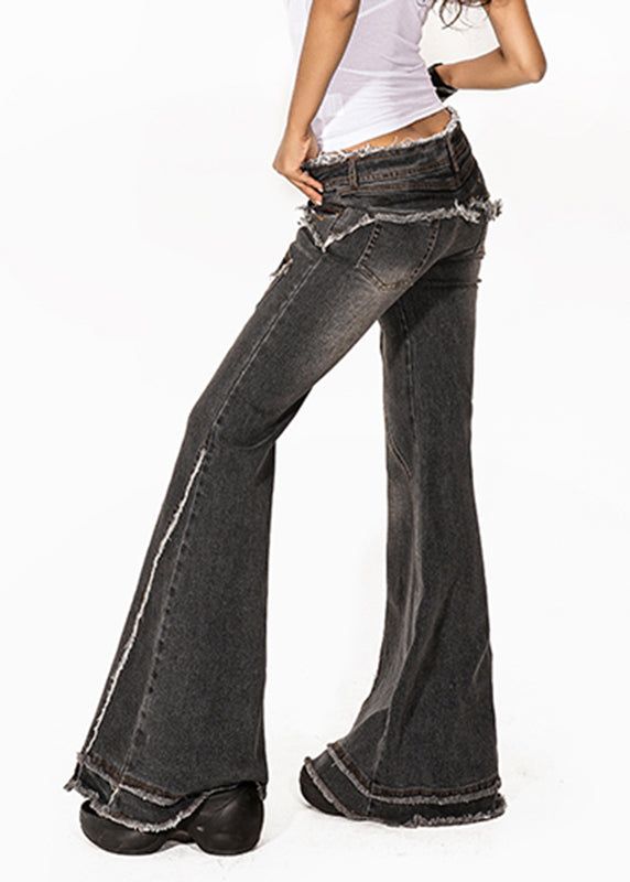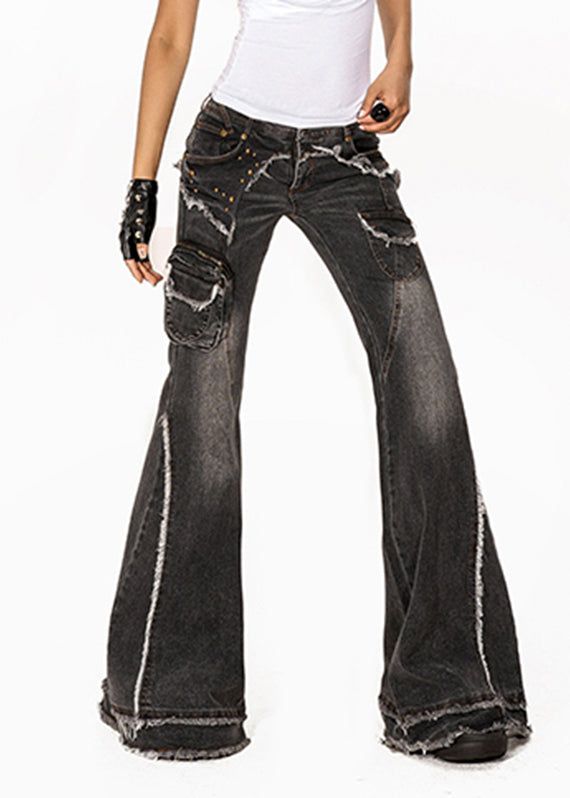 Retro Dark Grey High Waist Pockets Patchwork Jeans Summer