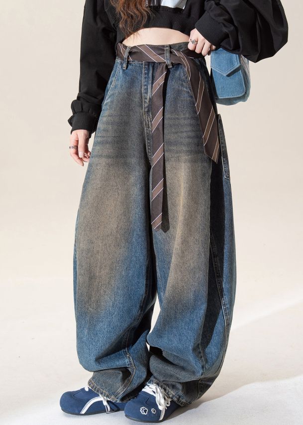 Vintage Dark Blue High Waist Pockets Wide Leg Jeans Fall